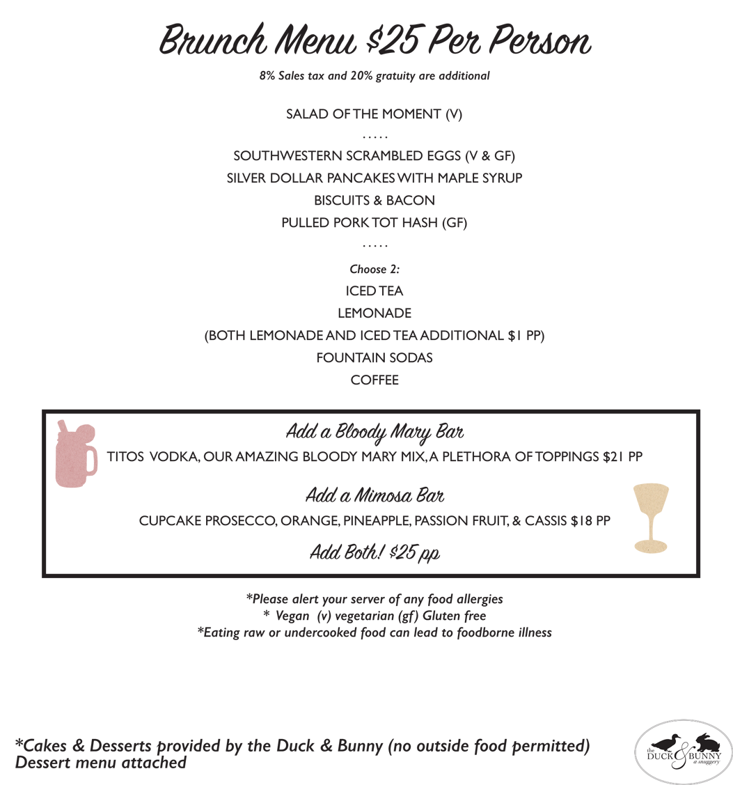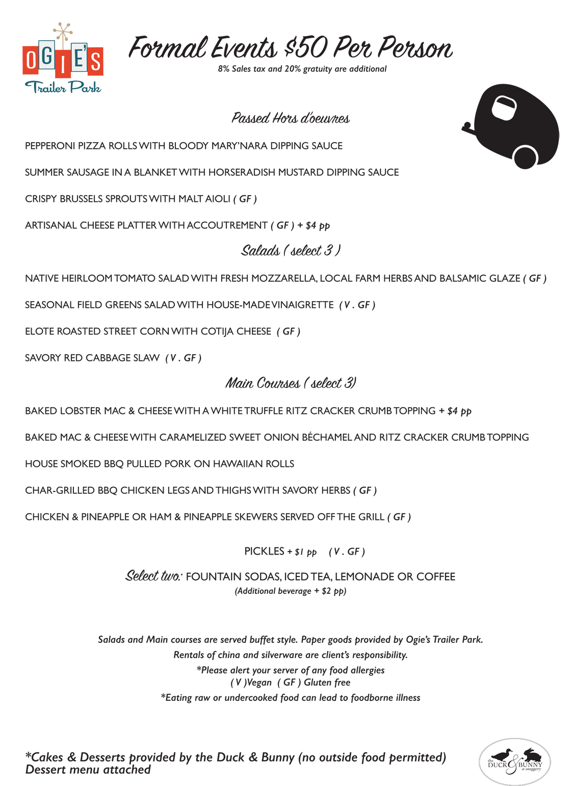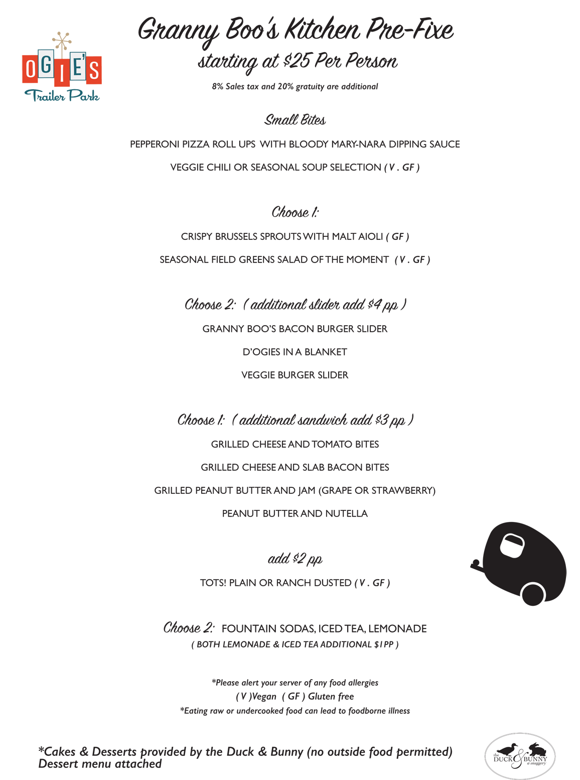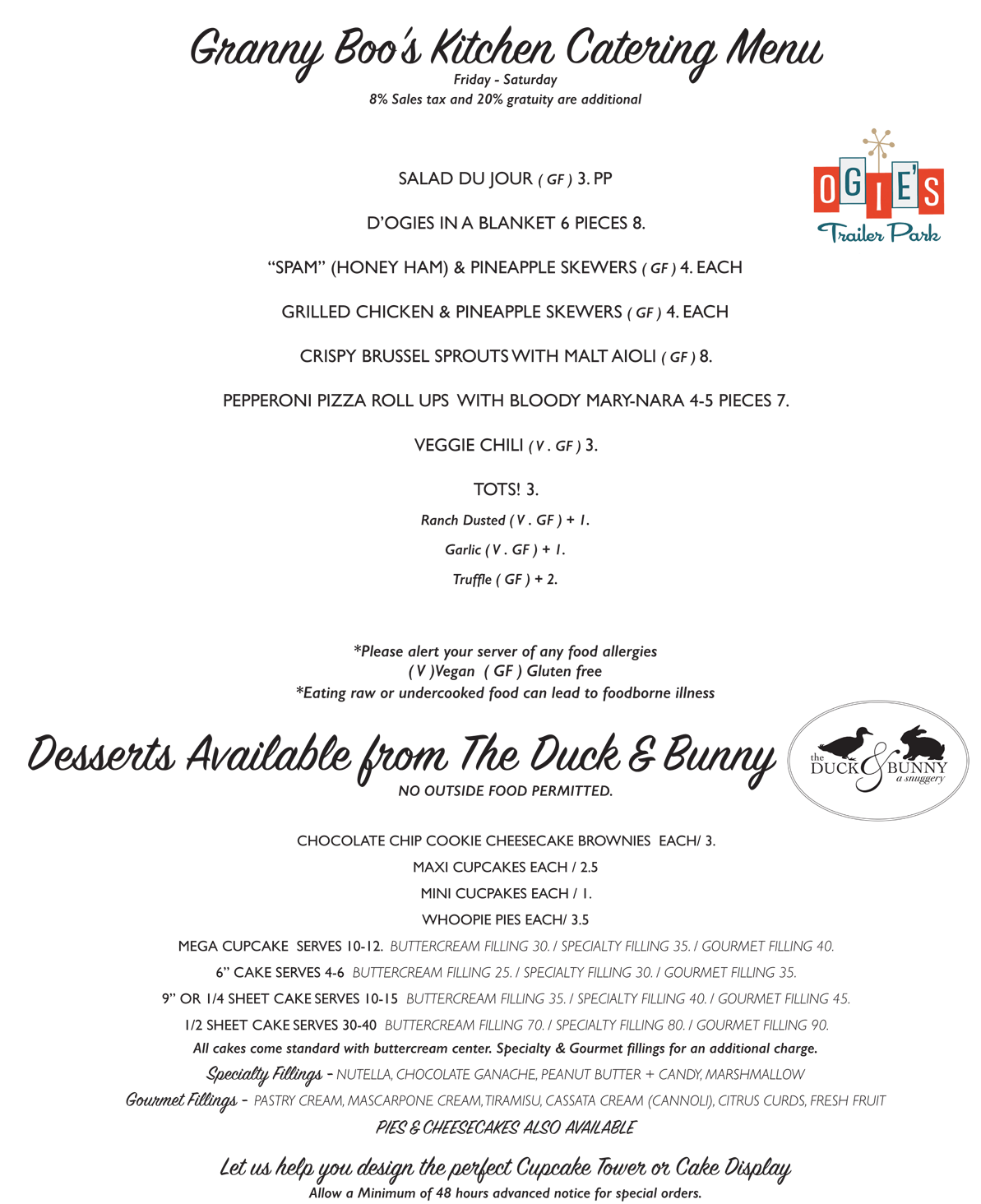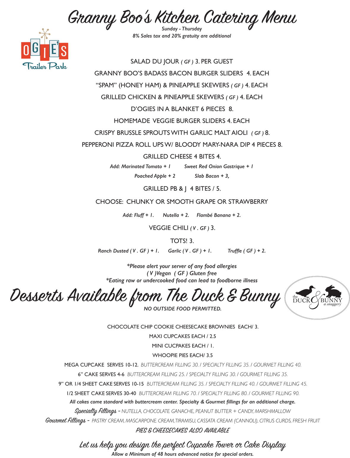 *A 25% Deposit will be charged upon signature of this contract. Deposit is non-refundable for cancellations made less than two weeks in advance. ogiestrailerpark@gmail.com Click Here to open PDF File for printing GUIDELINES *Additional time ~An additional hour, making event 4 hours total will be an additional charge. ~ For Weddings, additional time for ceremonies to the three hour party will be an additional charge ~ Ceremonies are best held on the patio with seating and standing room available ~ Guests are expected to depart by the time specified in this contract so that the restaurant may set up for regular service to resume in a timely manner. *Weather ~ In case of inclement weather, only the interior of the restaurant will be used. ~A 10’ tent may be provided by Ogie’s for additional coverage on patio ~ Host has option to rent a tent for the patio however, Ogie’s is not responsible for permits, rental, set up, or any damages we may incur. Host’s credit card will be charged for any damage to the property and therein. *Music – FOR FULL RENTAL ONLY ~ Host may bring an Ipod or laptop with music to be played over the speaker system. Otherwise we use Spotify or Pandora ~ It is possible an entertainment license may be obtained for the day of the event contingent upon board approval. All costs will be incurred by Hosts. ~ All music must be kept at a reasonable level so as not to disturb neighbors. *Décor and Flowers – FOR FULL RENTALS OR OGIE’S DISCRETION ~ Flowers and approved décor may be brought in by outside vendors. ~ Nothing is to be hung from walls or ceiling ~Set up time for décor is a half hour prior to the event. *Bakery ~ All baked goods are to be provided by The Duck &Bunny. No outside food is permissible. ~ Cupcakes, specialty cakes, wedding cakes, pies, cheesecakes and plated desserts are additional and not included in the per person price. ~All Bakery items must be ordered at least 48 hours in advance I authorize deposit amount of $___________ to be charged to my card that is non-refundable for cancellations less than two weeks prior to event. Signature______________________________________ Print__________________________ Date _________
